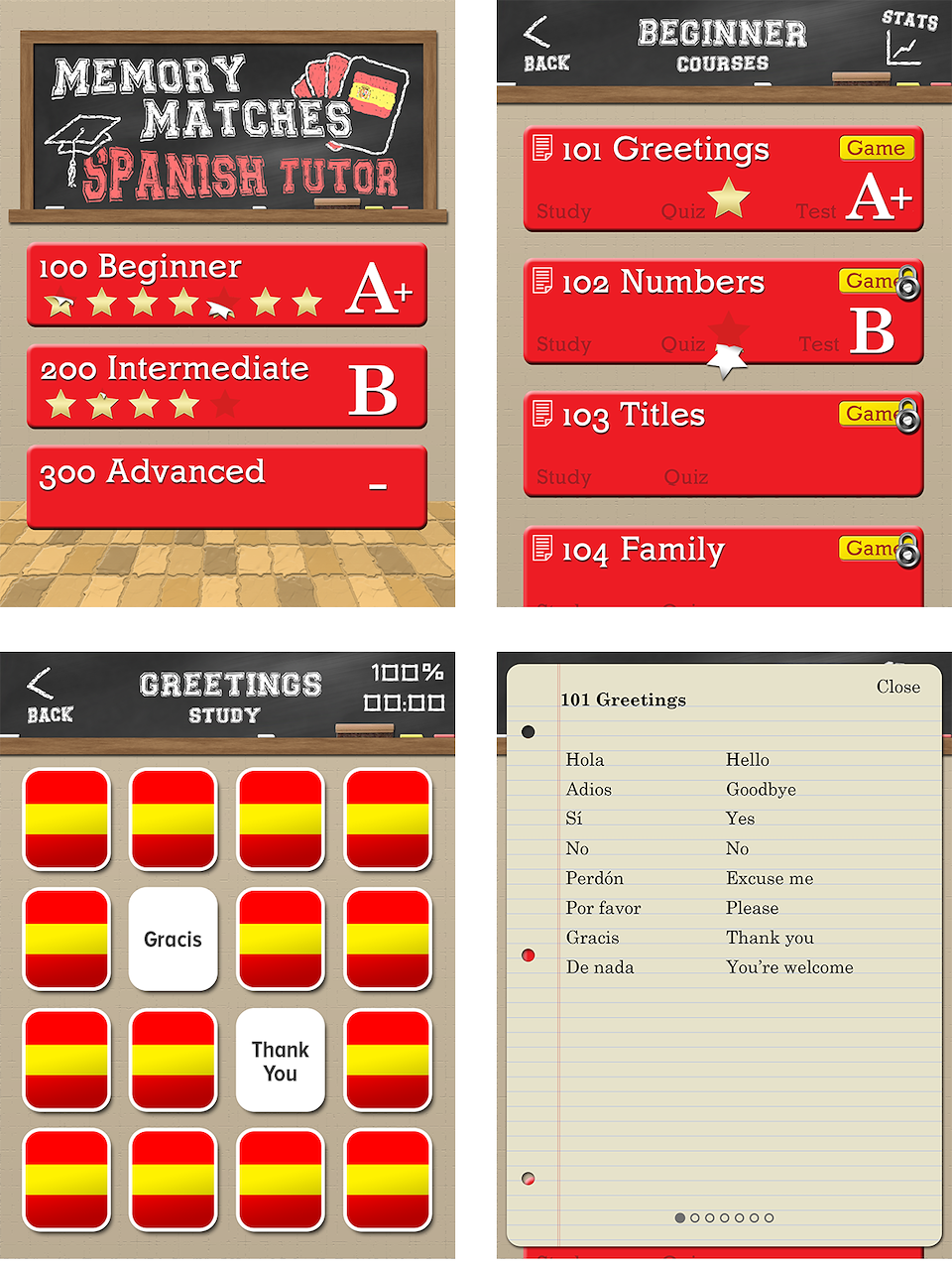 The user would have to unlock the game by proving competency at each level of courses. Each course offered study material (vocabulary words), quizzes, tests and a game. Quizzes were matching Spanish words with Spanish words; performing well would earn a gold star and unlock the test. Tests were matching English words with Spanish and performance was graded based on a combination of accuracy and speed. Earning an ‘A’ on the test would unlock the game associated with that course. If a user would have to wait three hours to attempt it again.